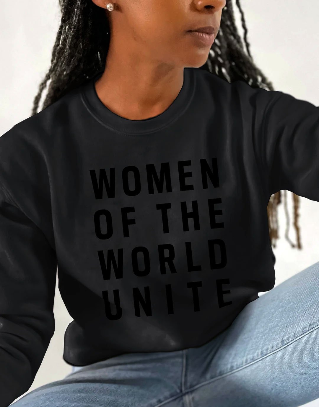 Black-on-black sweatshirt designed to raise funds for the National Organization for Women, in collaboration with Social Goods.